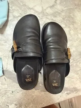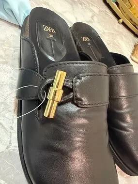 Zara Black Leather Slip-On Mules with Gold Bamboo Buckle