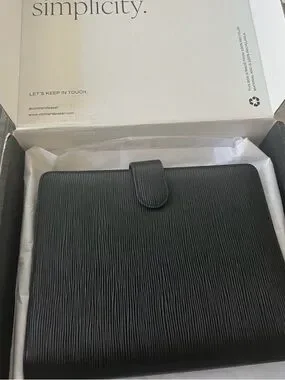 Stylish black folio designed for everyday organization. Features a secure snap closure for added protection. Sleek textured exterior complements professional looks. Lightweight and versatile for work or travel.