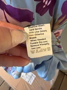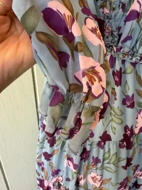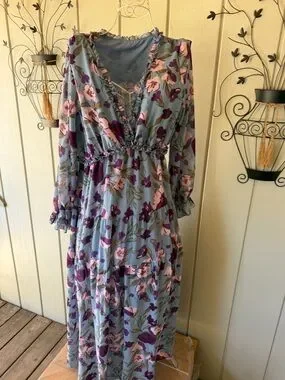 Flowing V-neck maxi dress in a soft blue base with pink and purple floral print. Elasticized waist and gentle ruffle trim create a flattering silhouette. Long sleeves with ruffled cuffs for a feminine finish. Lightweight, breathable fabric for comfortable all-day wear. Size XXL @6SH 3/26 CLST