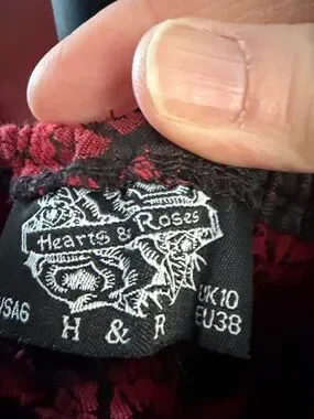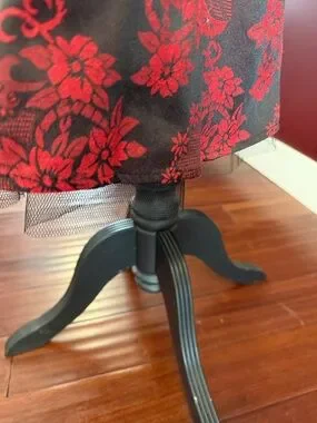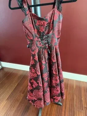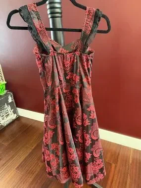 Flattering midi dress in a red floral pattern on a black base. Corset-style lace-up waist creates a defined silhouette. Sleeveless design with a feminine neckline for versatile wear. Lightweight, flowing skirt offers comfortable movement for day or night.