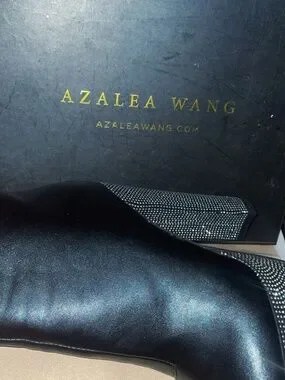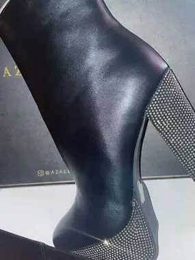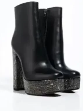 Classic black Sturdy Platform Round Toe Block Heel Boots encrusted with shimmering rhinestones