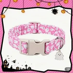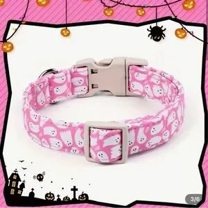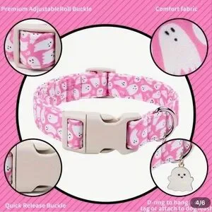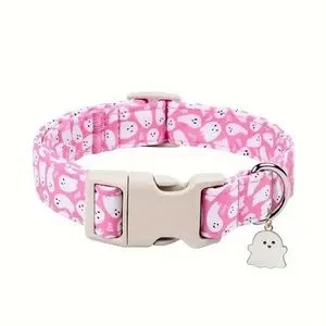 Cute pink pet collar with white ghost print. Features a matching ghost charm and sturdy plastic buckle. Adjustable and festive design. Fun Halloween-themed accessory. Size chart in photos above.