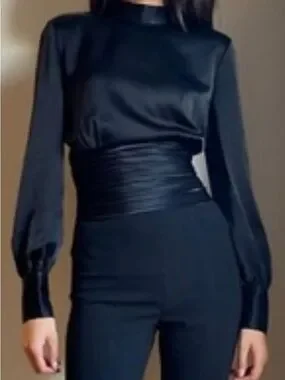 Tailored mock neck long-sleeve top in a solid black hue. Slightly fitted at the waist for subtle shape. Smooth, minimalist design for layered or standalone wear. Lightweight stretch for comfortable movement.