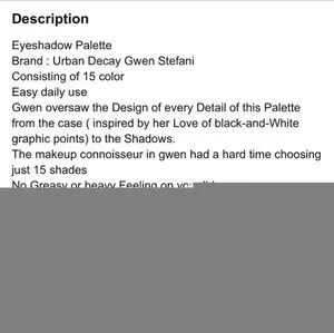 BRAND NEW; NEVER USED. New in box Gwen Stefani eyeshadow palette collaboration with Urban Decay. Limited edition. 15 eyeshadow shades. Film on mirror never taken off.