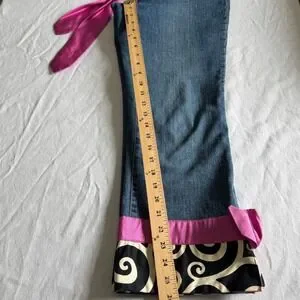 Too-She-She cropped jeans offer a playful, Y2K aesthetic with a vibrant pink 100% silk sash belt and matching decorative cuffs. These mid-rise denim pants feature a classic five-pocket design and a straight-leg silhouette that hits at a cropped length. The cuffs are uniquely detailed with a black and cream swirl pattern, topped with a pink silk band and a rhinestone-encrusted buckle accent on the side. Crafted from a comfortable cotton blend with a hint of spandex for stretch, these jeans combine whimsical charm with a flattering fit.