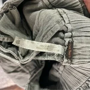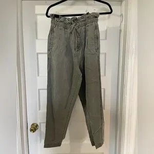Olive/washed army green pleated, relaxed, high-rise, tapered ankle trousers with paper bag silhouetted and drawstring waistband. 25 inch inseam, 41% rayon, 59% cotton. XS but fits Small/Medium.