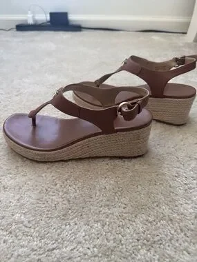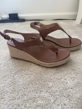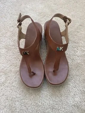 Classic Michael Kors thong sandals. Brown leather straps with MK logo accent. Adjustable ankle strap for a secure fit. Cushioned footbed for comfort. Elegant and versatile style.
