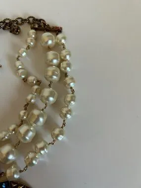 Triple-strand pearl necklace featuring a colorful crystal-encrusted double G pendant. Classic pearl strands pair with vivid gem accents. Statement piece for dressy looks.