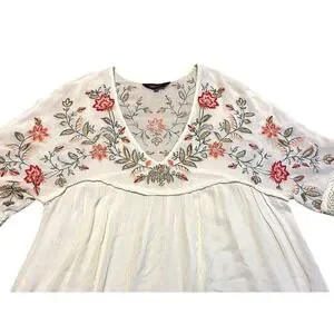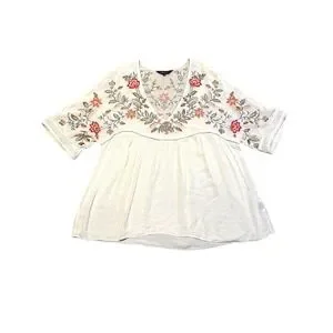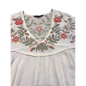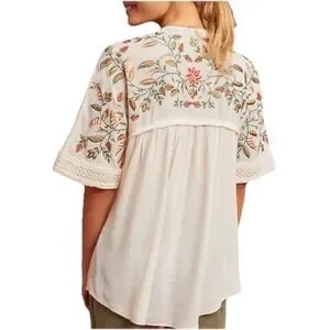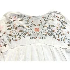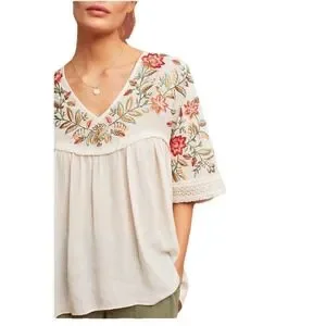 Ranna Gill for Anthropologie blouse features intricate floral embroidery across the yoke and sleeves, accented by delicate lace trim at the cuffs and chest. Designed with a flattering V-neckline and a flowy, babydoll silhouette, this lightweight top offers a bohemian aesthetic. The cream-colored fabric provides a soft backdrop for the vibrant red, orange, and green botanical needlework. A gathered empire waist and relaxed short sleeves complete this feminine piece.