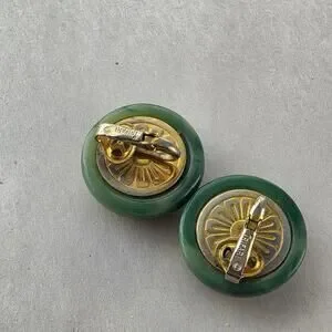 Crown Trifari Faux Jade Cabachon Clip On Earrings Gold-Tone Vintage Signed