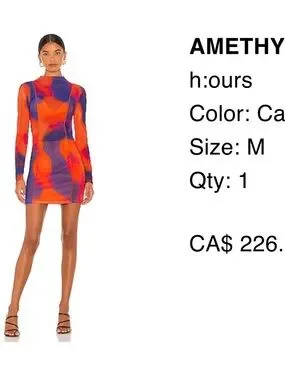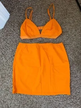 Eye-catching abstract print in purple and orange. Long fitted sleeves. Bodycon mini silhouette. Smooth stretch fabric for comfort. Purchased from Revolve- never worn. Bralette and skirt to wear underneath.