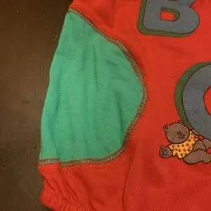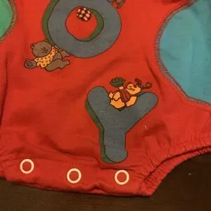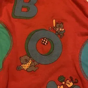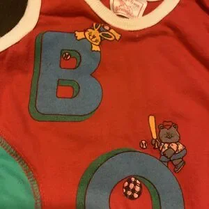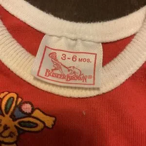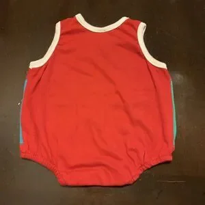 The Vintage Buster Brown Romper is a colorful one-piece outfit for boys aged 3-6 months. Made from 100% cotton, this romper features a playful baseball player design in primary colors, perfect for summer and spring seasons. The romper is from the brand Buster Brown, known for quality baby clothing, and is ideal for little boys who love football or baseball. This romper is a delightful and stylish choice for active baby boys.