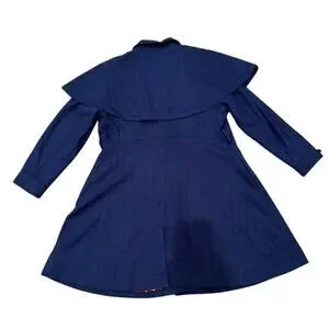 Inspired by her costume in the new Mary Poppins Returns, this blue & black herringbone tweed coat has a red & white polka dot lining and a cape-style rain flap on the shoulders. Hip pockets, concealed button closure and cuff button details.