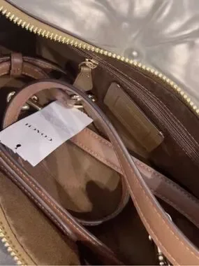 Coach shoulder bag in signature monogram canvas. Brown leather trim and logo plaque. Detachable gold-tone chain strap and leather strap. Zip-top closure and leather hangtag detail.