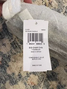 Coach CL405 Charlotte Shoulder Bag In Signature Canvas IN Khaki Saddle Signature coated canvas and smooth leather Inside zip pocket Zip-top closure fabric lining Detachable chain strap with 8 1/4 drop Detachable strap with 22 3/4 drop for shoulder or crossbody wear 10 (L) x 4 1/4 (H) x 3 1/4 (W) Style No. CL405 UPC;195031996009 SKU;CO3454.