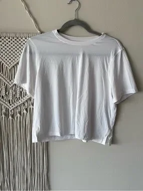Lightweight women's short sleeve tee. Relaxed boxy fit with crew neckline. Smooth, breathable fabric ideal for low-impact activities. Simple, versatile design for layering or solo wear.