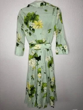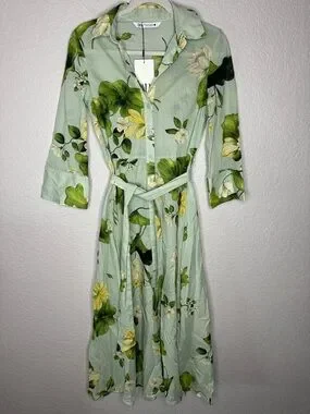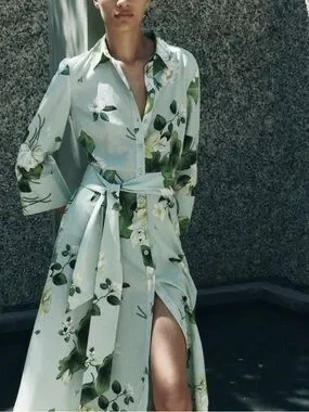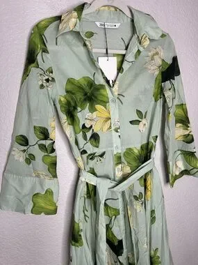 NWT Zara ZW Collection Green Floral Button Down Shirt Dress Midi w/ Belt XS