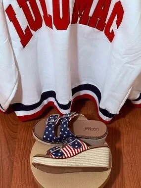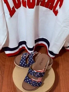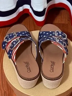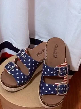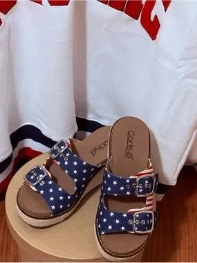 Fun wedge sandals with two adjustable buckle straps. Star print on navy upper and red-and-white striped accent. Cushioned footbed for comfort. Easy slip-on style for all of your summer celebrations, vacations, or denim outfits.