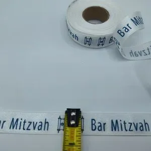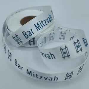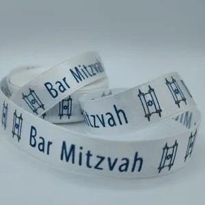 Offered by Lux Ribbon Room, this is a 2-yard cut of Bar Mitzvah–themed decorative ribbon, featuring classic blue typography and Torah scroll motifs on a crisp white background. Perfect for gift wrapping, favors, ceremonial packaging, or synagogue event presentation. A refined finishing touch for an important milestone.