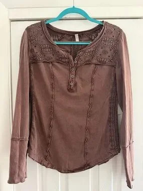 ๐ค Free People Brown Crochet Yoke Henley Long Sleeve Top ๐ค