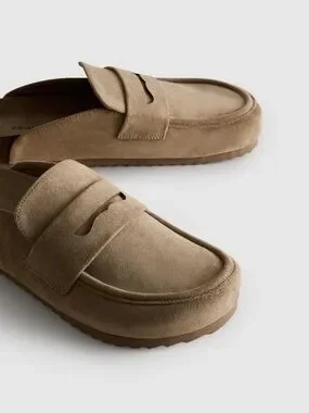 Classic slip-on penny loafer mules in tan suede. Soft suede upper with a clean penny strap detail. Cushioned insole for all-day comfort. Versatile tan color pairs easily with casual and smart-casual looks.