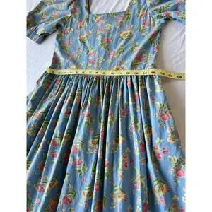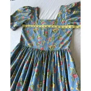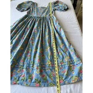 VTG Komil Honolulu Dress Square Neck MIDI Blue Floral A-line Puff Sleeves SM