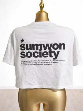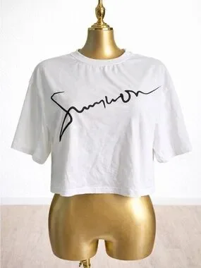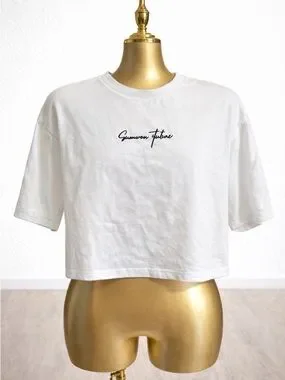 Crisp white cropped tee featuring bold black graphic text. Lightweight, breathable fabric for comfortable everyday wear. Clean crew neckline and relaxed short sleeves for easy layering. Stylish black script and statement print for a modern, casual look.
