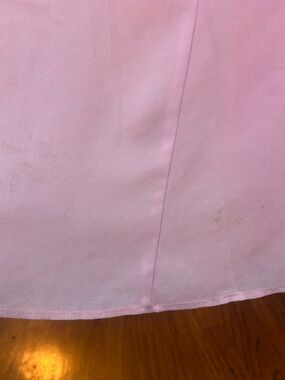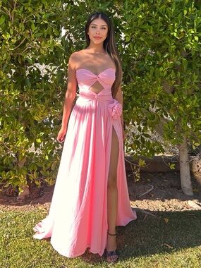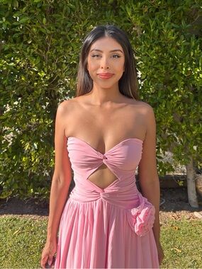 Elegant strapless pink evening dress with a sweetheart neckline and keyhole front. Soft pink color with a side high slit and floral waist detail. Flowy silhouette designed for formal events and special occasions. It is a floor length dress and meant to drag on floor. There are faint stains on hem because it’s a floor length dress. Not visible unless brought up to the light.