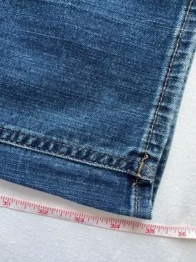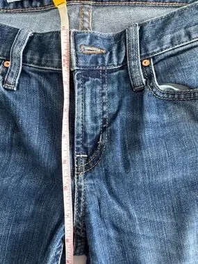GAP denim with subtle distressing on the front. Classic five-pocket styling with visible rivets. Medium dark blue wash with lived-in fading. Clean straight-leg silhouette.