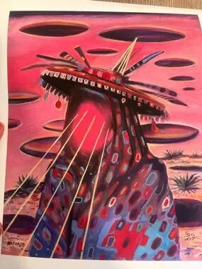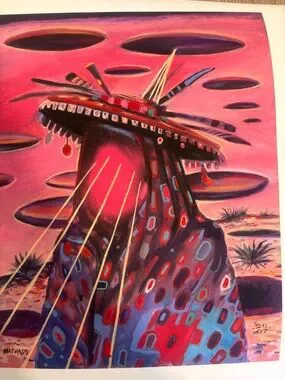 Bold pink abstract art featuring a tribal-inspired figure with vivid red and blue accents. This striking piece showcases dynamic lines and geometric patterns in pink, red, blue, and purple. A modern focal point that adds color and personality to any room.