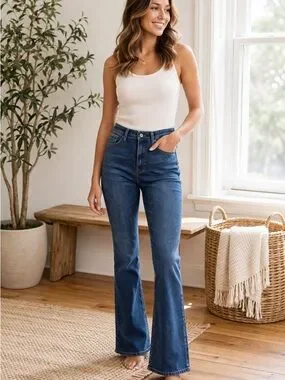 Abercrombie & Fitch high rise flare jeans in a flattering medium wash. Classic everyday denim with a modern vintage-inspired silhouette.