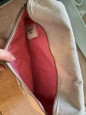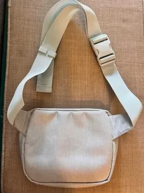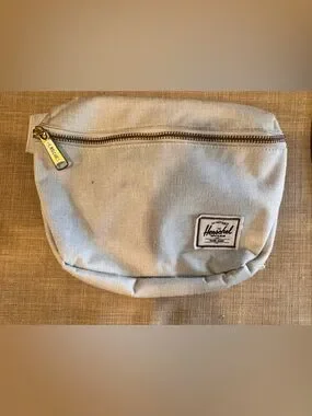 Sleek Herschel hip pack in a light cream tone. Top zip main compartment and front zip pocket. Adjustable strap for versatile wear. Signature Herschel logo patch on front.