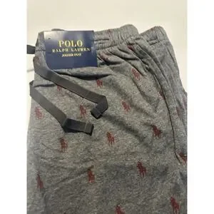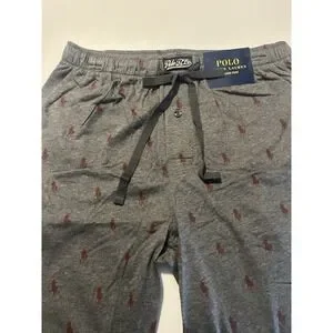 The Polo Ralph Lauren Mens Jogger Pants in size M-L feature an allover pony print design in a stylish gray color. Made from 100% cotton jersey fabric, these lounge pants have a drawstring closure for a customizable fit. With a classic and lightweight design, these pants are perfect for lounging in comfort and style. The iconic Polo Ralph Lauren brand adds a touch of luxury to this versatile piece, making it a must-have for men's sleepwear.
