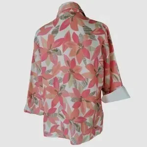 Stylish floral shirt with button-up front. Features a vibrant pattern.