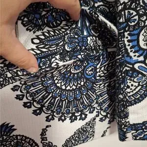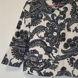 Talbots cotton modal blend blazer in elegant blue paisley design on flawless white.