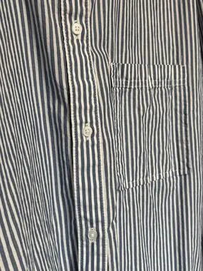 Lightweight, casual button-down with vertical blue and white stripes. Features a single chest pocket and full button front. Relaxed fit for everyday wear. Pairs well with jeans or chinos.