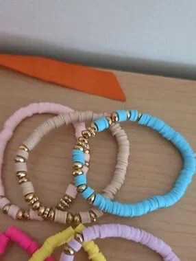 Set of bright stretch bracelets stored in a cheerful green polka dot organizer. Includes multiple stretch bracelets in pink, blue, yellow, orange, white, purple, tan and gold-accent beads. Soft, lightweight pieces made for everyday play and easy wear. Vibrant green organizer keeps bracelets tidy and portable.
