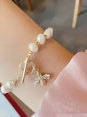 Elegant Gold & White Pearl Charm Bracelet - Women Jewelry