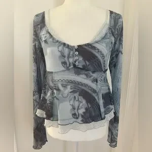 Stylish sheer blue long sleeve top with button details. Perfect for layering.