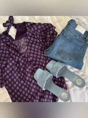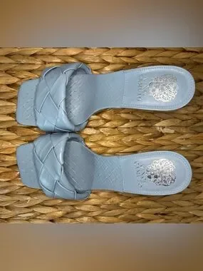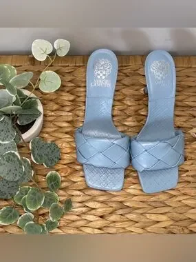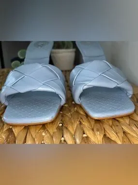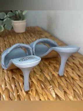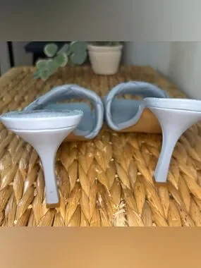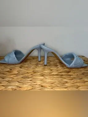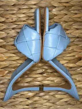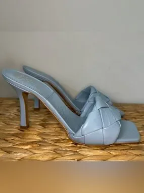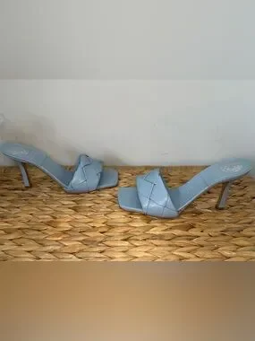Sleek woven leather upper. Open square toe design. Padded footbed for comfort. Stiletto heel for height. Polished light blue finish.