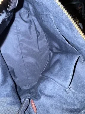 Coach Small Kelsey Satchel in midnight navy pebble leather with gold-tone hardware. Carries as a top handle or crossbody. Leather is supple and full with no cracking, fading, or odor. Hardware and zippers are bright and functioning perfectly. Bottom shows minimal use. Interior lining is clean.