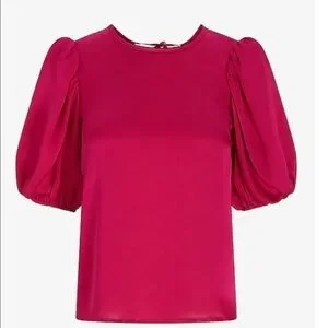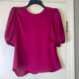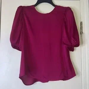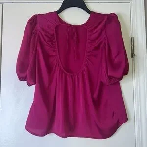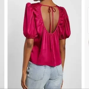 A luxurious satin blouse featuring short puff sleeves, a flirty open scoop back with ruching details, and tie-back closure. This top looks great at work or for drinks.