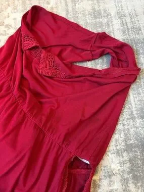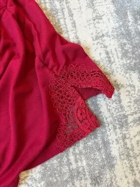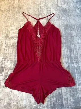 Soft burgundy romper with a deep lace V-front. Thin adjustable straps cross at back. Elastic waist for a comfortable fit. Lace trim at leg openings for a feminine touch. New. Never wore. Only hand washed.