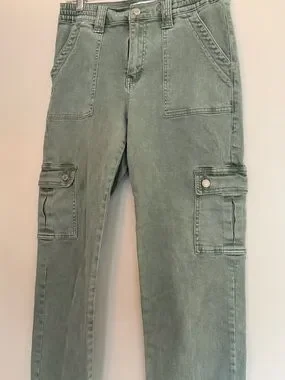 Functional olive green cargo pants designed for everyday wear. Multiple flap and patch pockets provide secure storage. Elasticized waist detail enhances comfort and fit. Straight leg silhouette pairs easily with tees and jackets. Durable cotton-blend fabric for reliable, casual styling.