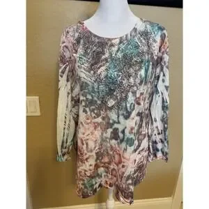 The Reba Southwestern Boho Embellished Tunic Top in XL is a stylish and versatile piece for women. This tunic features a round neckline, 3/4 sleeves, and a pullover closure for easy wear. Made from a blend of polyester and rayon, the top is lightweight, stretchy, and suitable for all seasons. The multicolor design is accented with beading, rhinestones, and embroidery, adding a touch of boho flair to the overall look. Perfect for women looking for a trendy yet comfortable t-shirt option.