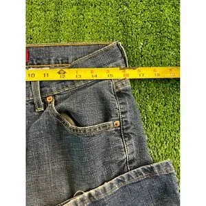 Levi Strauss Signature mid rise bootcut jeans size 8 short offer a classic silhouette with a medium wash finish and subtle fading for a lived-in look. These versatile denim pants feature a standard five-pocket design, contrast stitching, and a comfortable stretch blend that maintains its shape throughout the day. The slight flare at the hem makes them ideal for pairing with boots or sneakers, providing a timeless aesthetic suitable for casual outings or everyday wear.