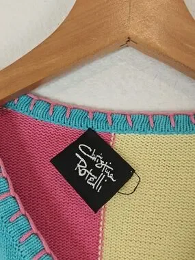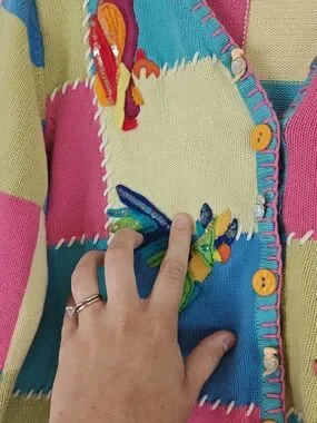 Obsessed is an understatement 💖 This vintage Christina Rotelli cardigan is a wearable piece of art—featuring vibrant patchwork panels, whimsical embroidered birds, and bold contrast stitching throughout.