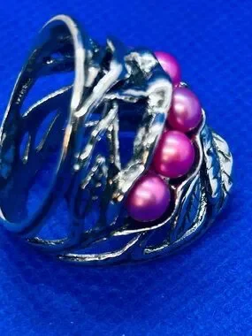 Passage to Israel silver-tone leaf ring featuring a row of bright pink fresh water pearls across the center. Feminine and eye-catching, the pink pearls add a vivid pop to the intricate silver leaf design. Ideal for dressing up day or evening looks. Handcrafted. Size 8.5.
