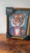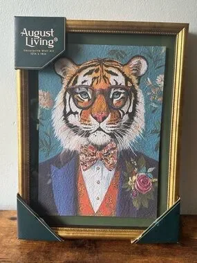 Framed decorative wall art featuring a dapper tiger in glasses and bow tie. Rich blue textured background with orange and gold accents. Ready to display. Stylish and whimsical piece. Can be hung. Gold frame with plexiglass cover. Measures 12 x 16 inches. Brand new.