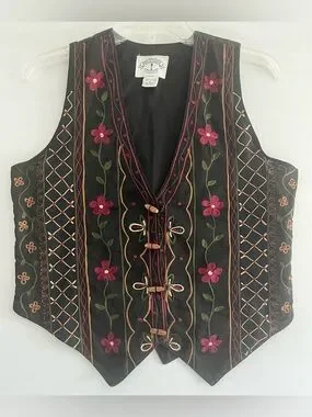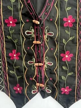 Boho Cottagecore Embroidered Floral Vest. Step into a whimsical, vintage-inspired dream with this stunning black cotton vest. Featuring intricate maximalist floral embroidery in shades of berry, sage, and gold, this piece is a masterclass in the cottagecore and grandmacore aesthetics. The structured silhouette is balanced by charming wooden toggle closures and delicate scalloped-edge detailing, making it the perfect layering piece for a transition wardrobe.